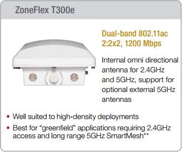 The ZoneFlex T300 Series are the first dual-band 802.11ac outdoor access points (APs) designed explicitly for high density public venues such as airports, conventions centers, plazas & malls, and other dense urban environments.